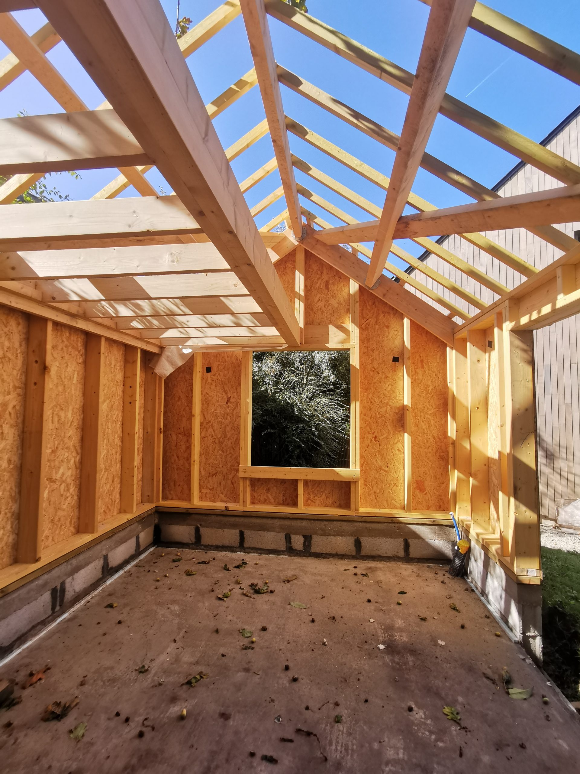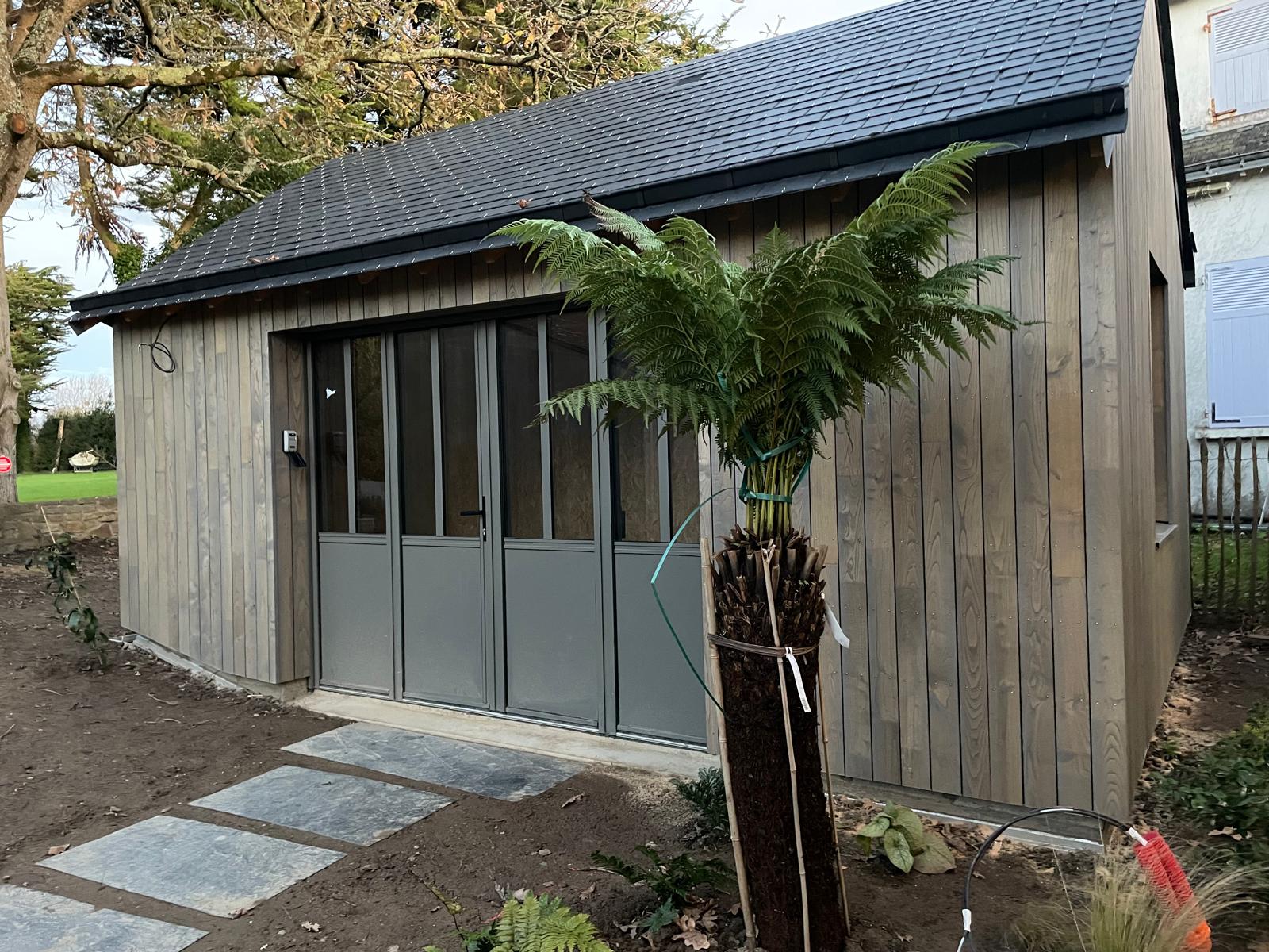 La loge est aussi en ossature bois avec un bardage en chataîgnier à claire voie identique à celui de la maison.