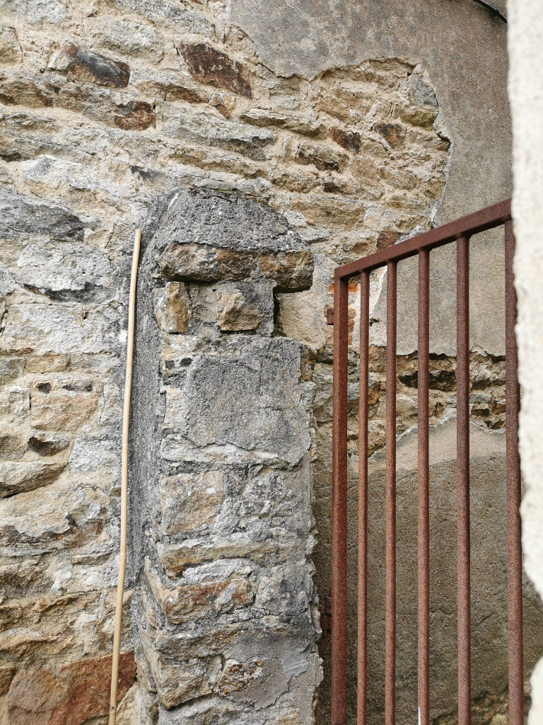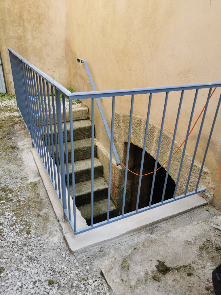 Pour le mur de clôture Portail : les anciennes poutres en bois étaient en très mauvais état, après étaiement, elles ont été remplacées par des poutres métalliques laissées brutes de galvanisation. Les pierres ont été remaçonnées par endroit et reprises avec un joint chaux-sable. Des éléments tels que portillons de jardin, garde-corps d’accès à la cave, garde-corps d’escalier extérieurs ont été créées ou refaits entièrement.