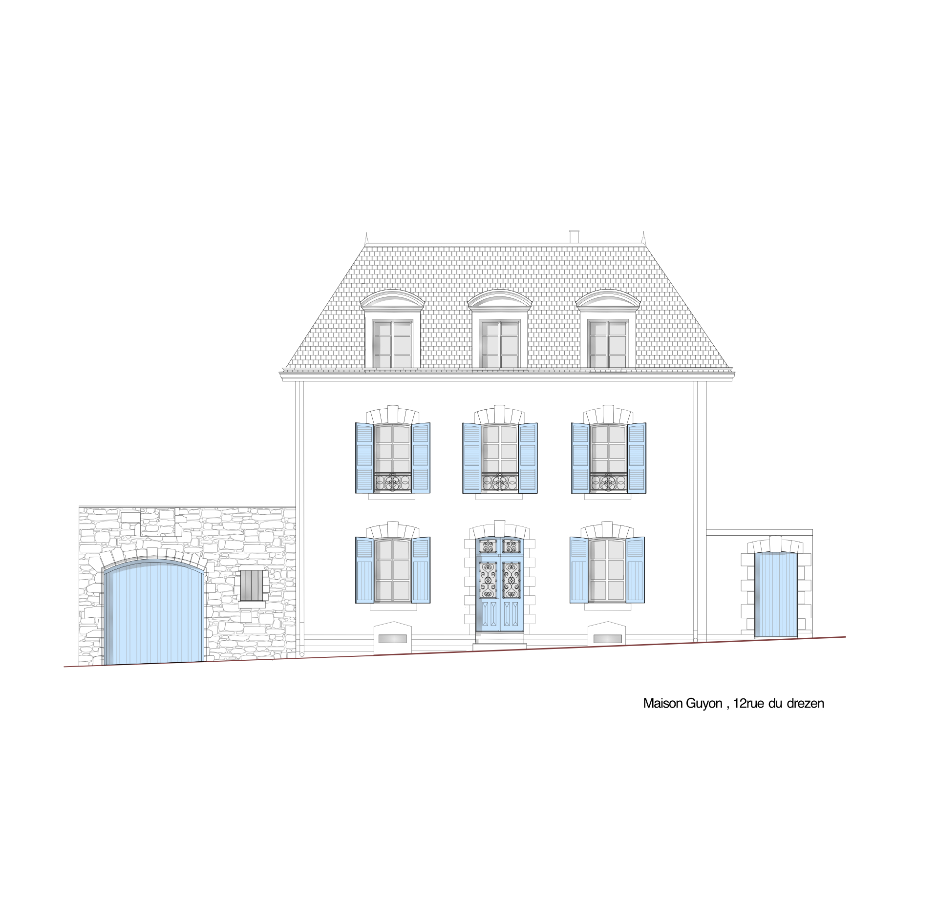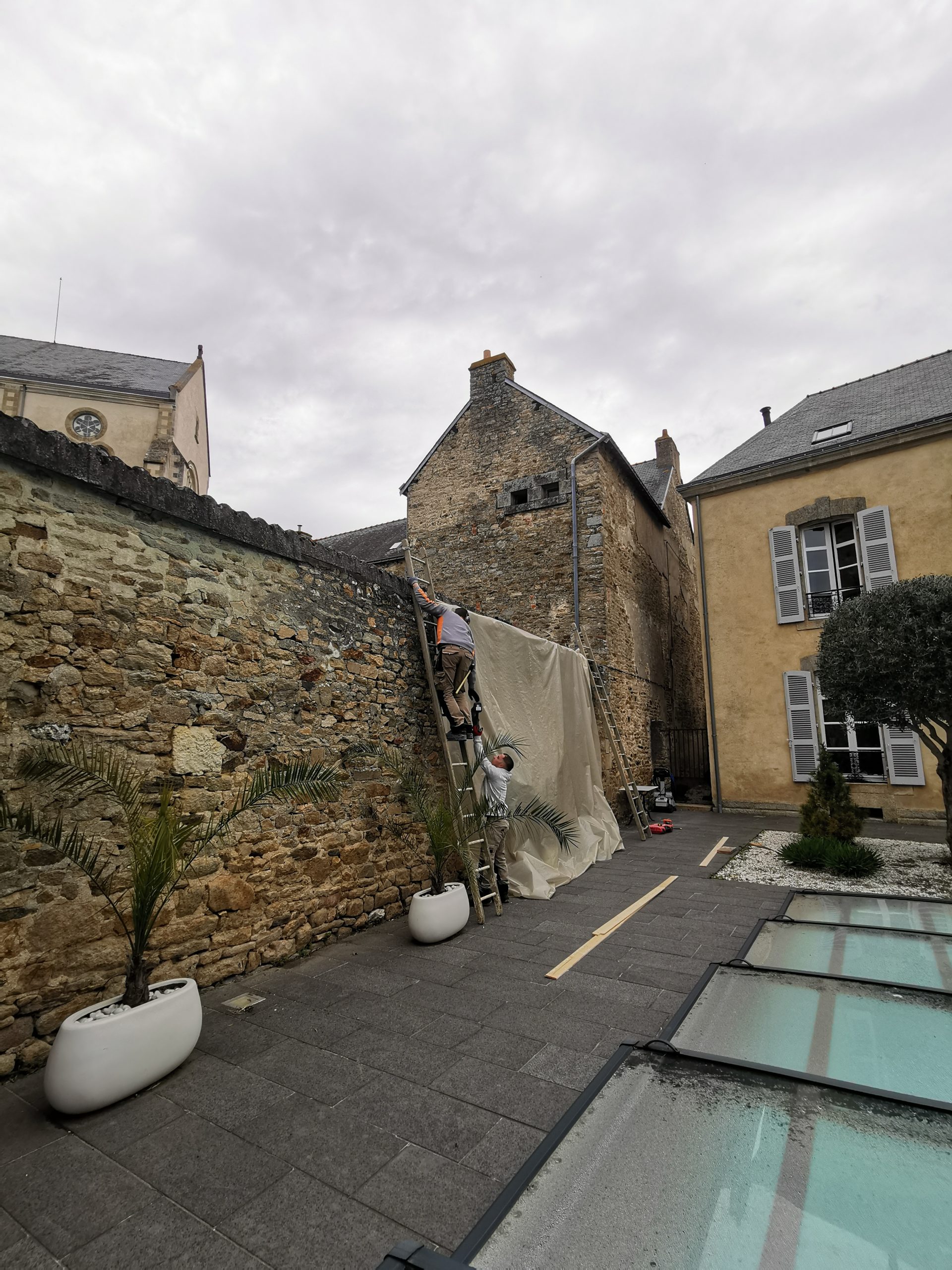 Le projet se situe à une rue de la rive droite du port de Vannes, dans le secteur sauvegardé. Il concerne une ancienne école primaire transformée en maison d’habitation par les anciens propriétaires, mais à l’arrivée des nouveaux propriétaires quelques éléments s’avèrent être à reprendre comme le grenier à transformer en chambre d’amis /bureau et le grand mur en pierres de clôture sur rue abritant le portail d’entrée qui est en très mauvais état. La cave est à assainir, un plancher sous une douche menace de s’effondrer.