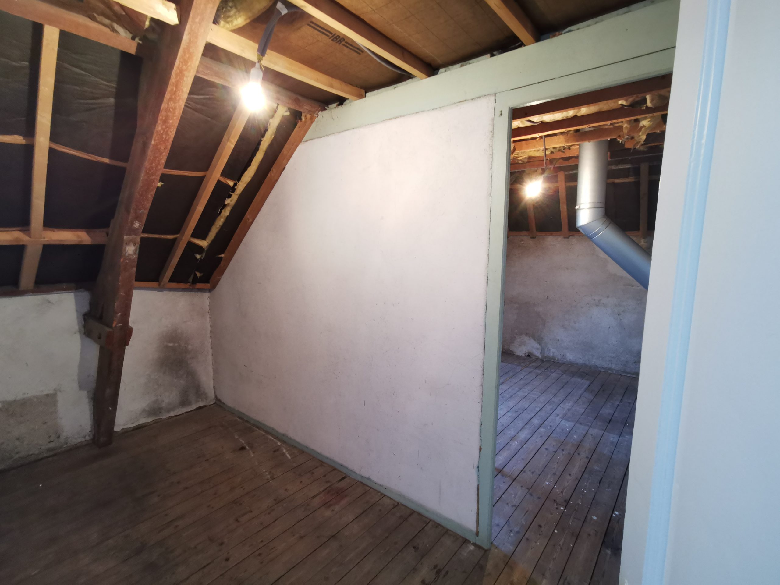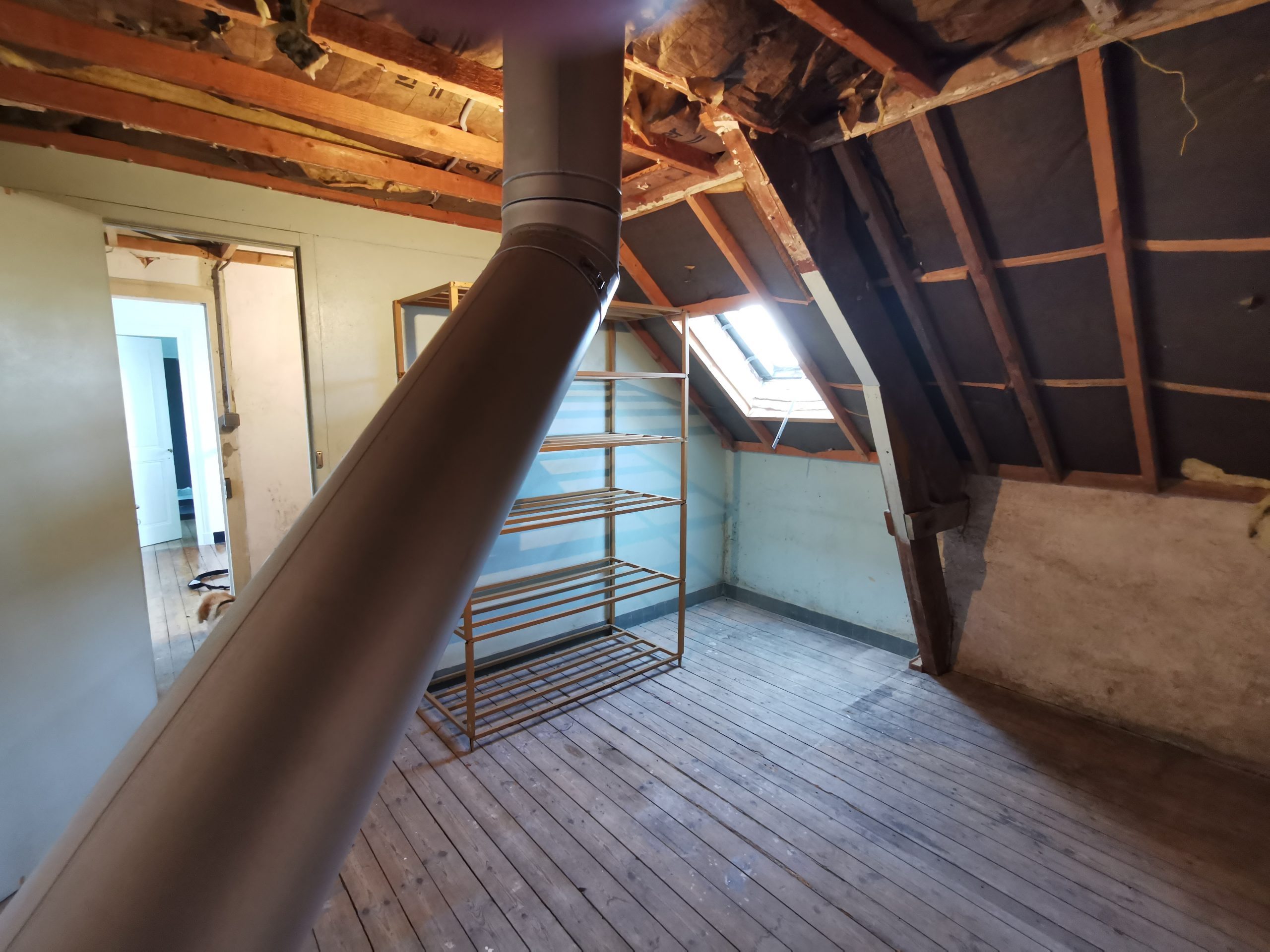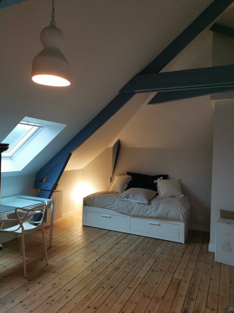 Pour le Grenier, une cloison briques a été démolie afin de libérer l’espace, le plancher bois ancien a été poncé puis vitrifié, le conduit de fumées inox était à encoffrer dans un doublage coupe-feu, tous les murs et plafonds rampants ont été isolés et doublés en placoplâtre, les beaux éléments de charpente ont été poncés puis repeints afin de les faire apparaître, enfin une fenêtre de toit patrimoine a été installée plus grande que l’ancienne et plus performante énergétiquement. Le grenier est devenu une jolie chambre d’amis /bureau.