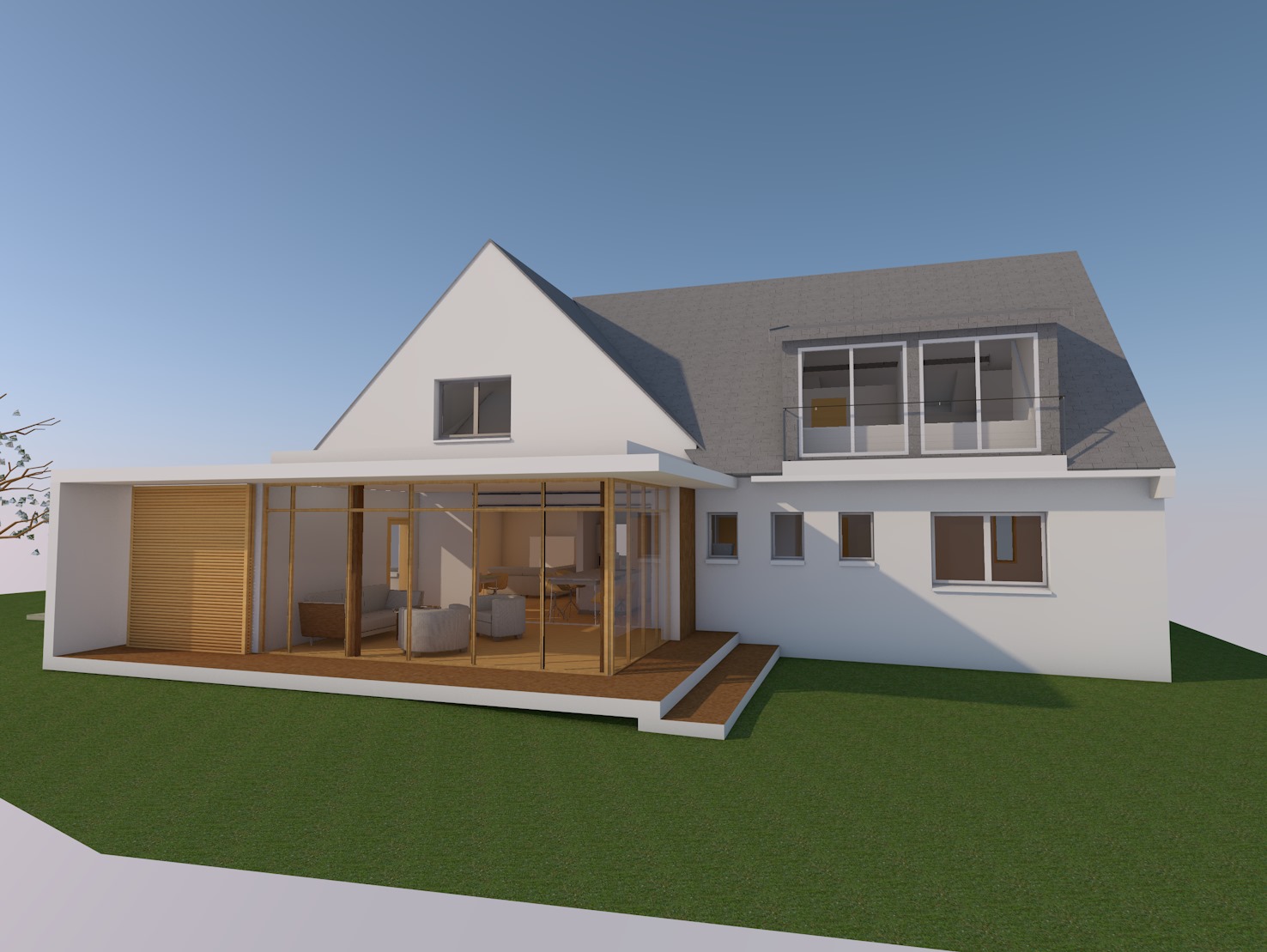 Le maître d’ouvrage souhaitait faire une extension pour profiter de la vue sur le golfe du Morbihan. La maison ayant subi des remaniements par le passé, les pièces de vie initialement à l’étage se sont retrouvées au Rdc orientées au sud sur la piscine mais tournant un peu le dos au golfe.