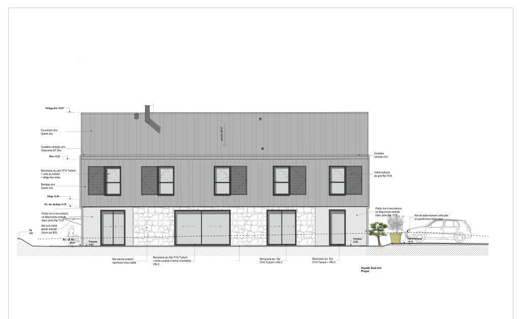 La bâtisse a gardé son volume en plan et conservé ses murs en pierres au RDC. Le rez-de-jardin comporte l’entrée de la maison les pièces de vie : cuisine – salle à manger et salon, cellier-buanderie. L’ancienne charpente et sa couverture en fibro ciment ont été déposées, la surélévation de la bâtisse en ossature bois a permis de créer un étage pour y accueillir 4 belles chambres, les pièces d’eau et un bureau.. La nouvelle couverture est en zinc prépatiné gris identique au bardage de l’étage. Les menuiseries sont en aluminium gris foncé.