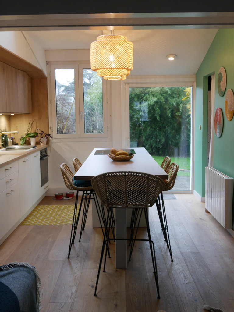 La cuisine est entièrement redessinée et repensée en meubles blanc et stratifiés chêne (en accord avec le sol) en exploitant la hauteur sous plafond pour des rangements supplémentaires. Une longue table ilôt en stratifié chêne permet de créer une vraie table à manger pour 5.