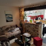 Le projet consiste à agrandir visuellement et éclairer la pièce du bas en ouvrant l’espace salon sur la cuisine par la démolition d’un muret (bar) en pierres. Les pierres étaient jointoyées au ciment et peintes en blanc. Un sablage et un rejointoiement à la chaux permettent de retrouver la couleur naturelle de la pierre et de laisser respirer les murs.