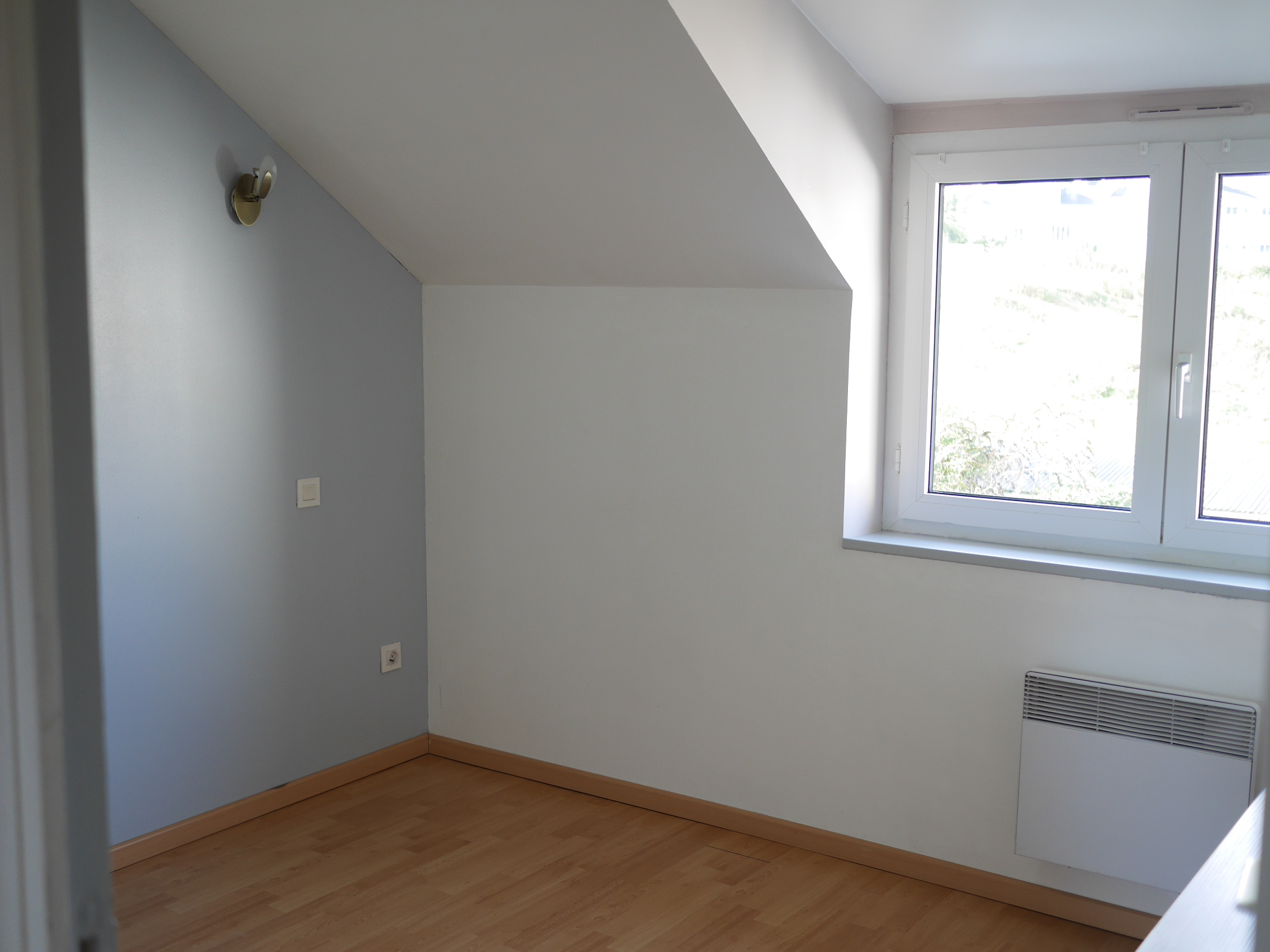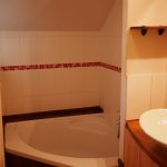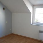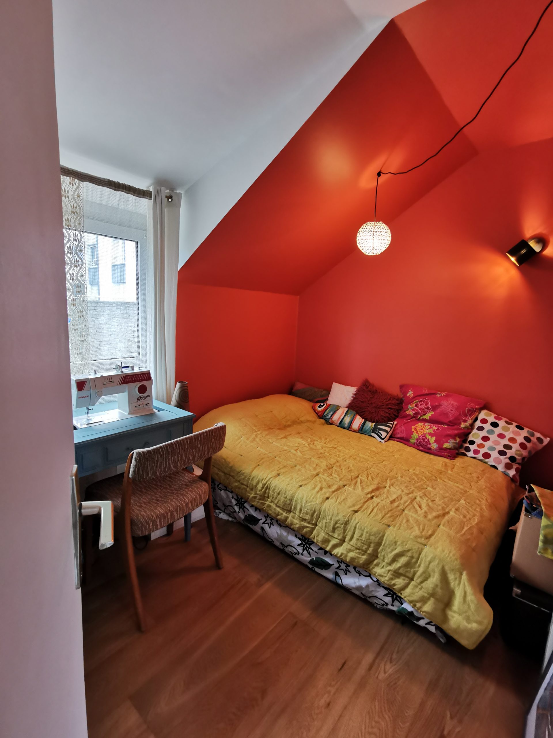 La salle de bains de l’étage est repensée avec un meuble desserte vintage chiné plus petit, transformé en plan vasque qui permet l’ajout d’un wc. Des zelliges blanches et un grand miroir rond viennent agrandir cette pièce. Les chambres sont repeintes, un jeu de couleur dans l’alcove d’une chambre et une tapisserie à décor rajoutent de la personnalité et de la profondeur à ces deux petites chambres. Le même parquet en chêne qu’au Rdc vient réchauffer ces pièces.