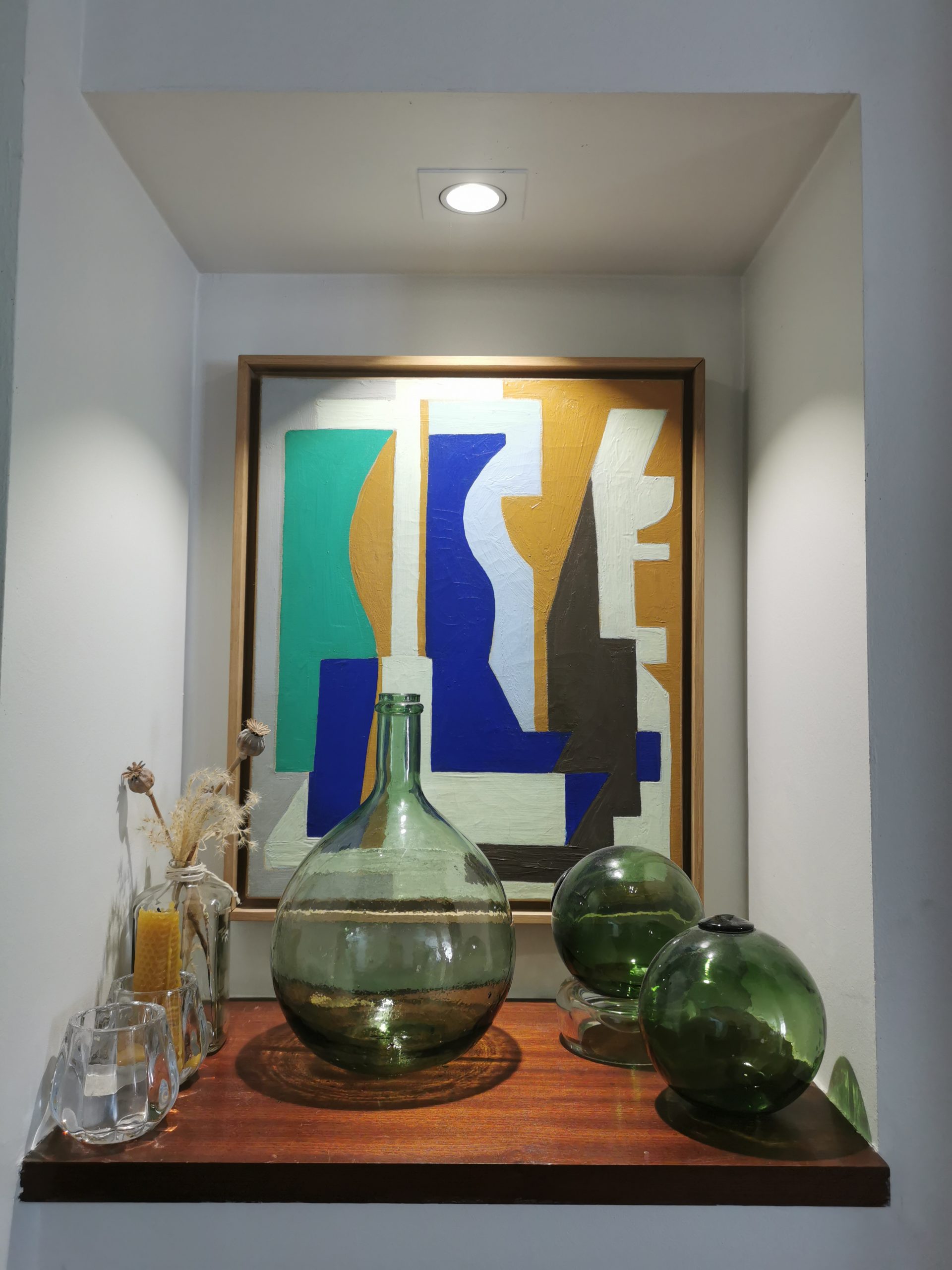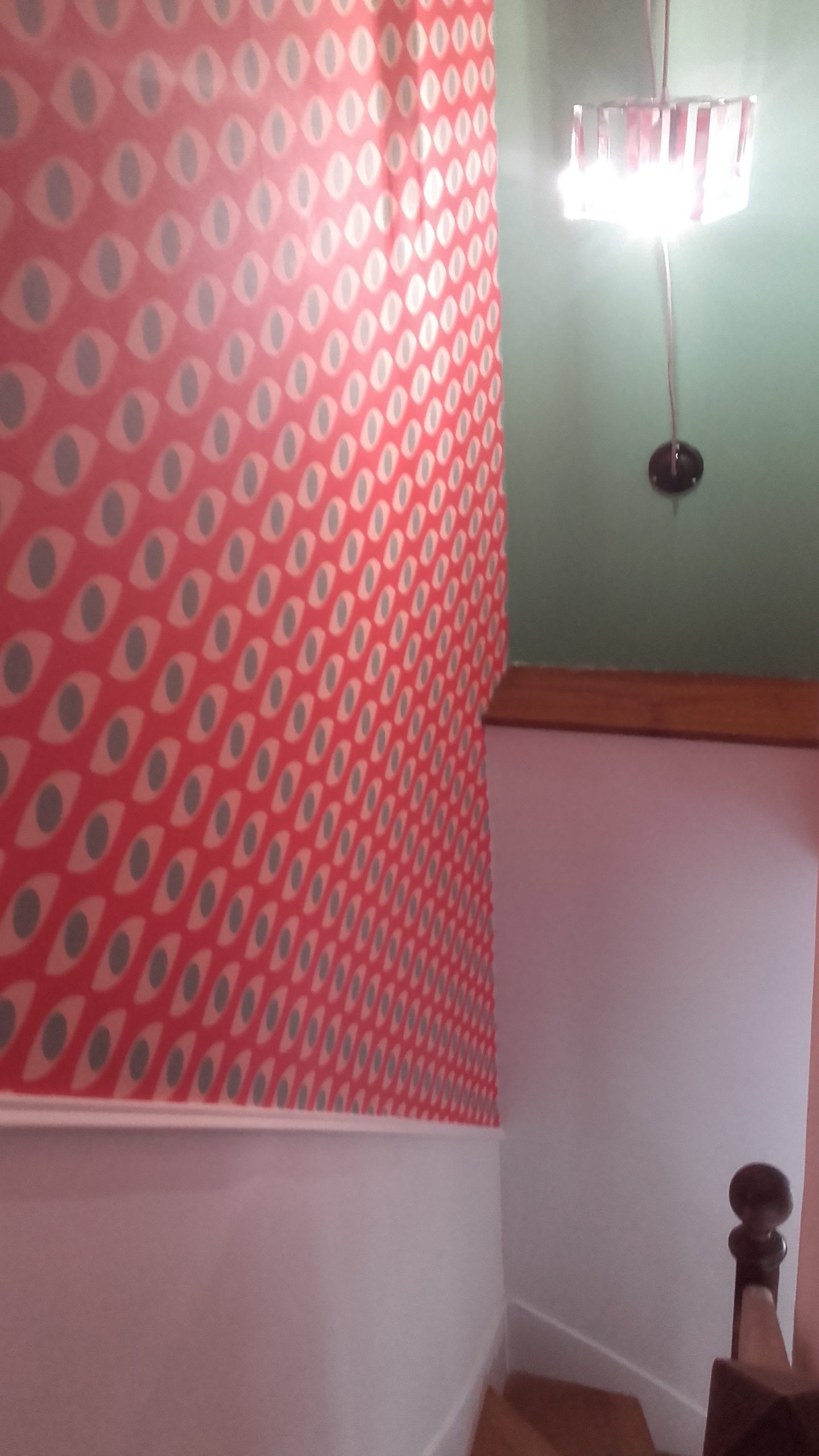 L’escalier triste et sombre retrouve de la gaité avec la peinture blanche des contremarches et une tapisserie à motif très colorée. Une bibliothèque est ajoutée dans la niche peinte en vert.